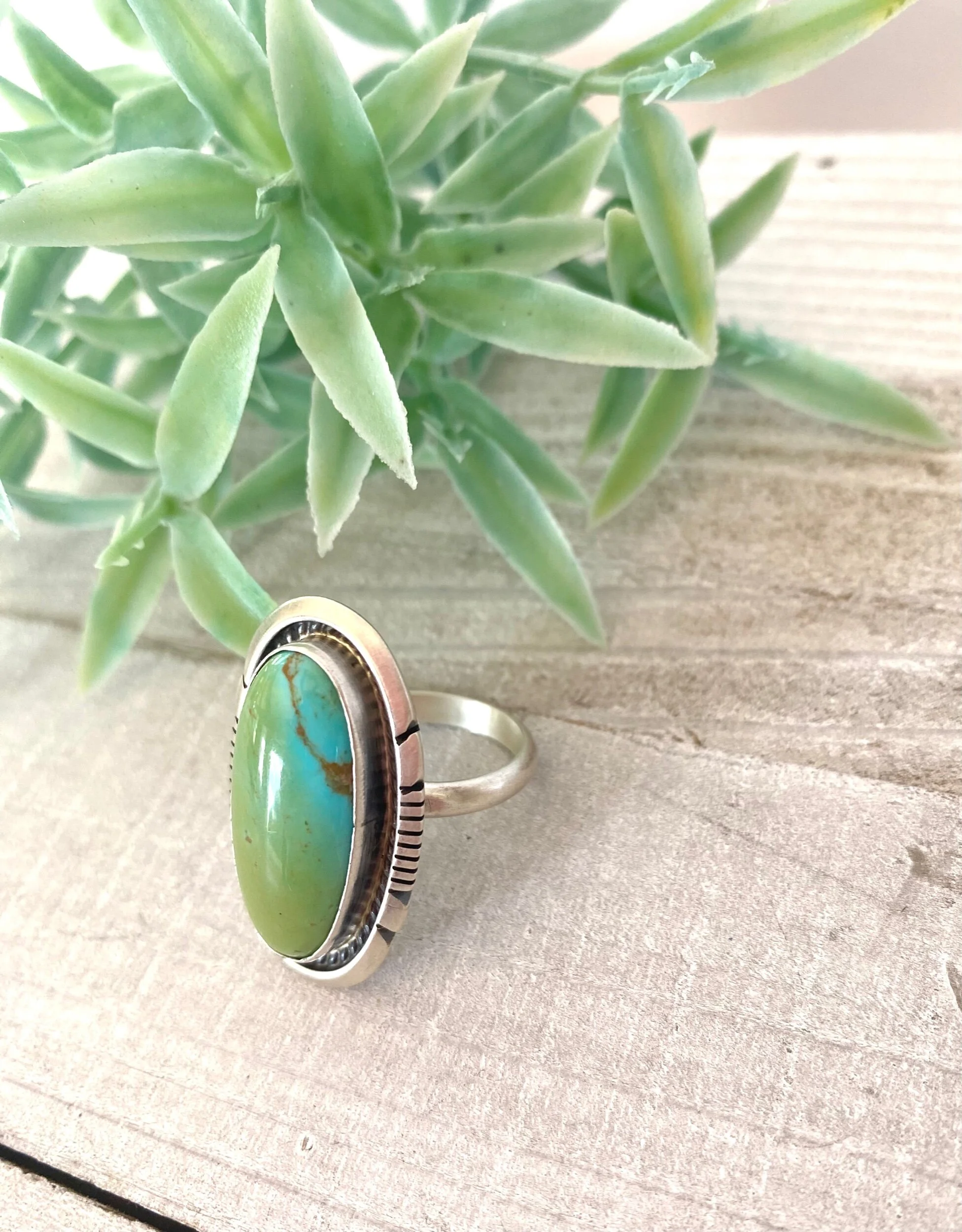 This turquoise stone is amazing! It’s high grade Kingman with gorgeous greens and blue’s running through. The best part? It’s adjustable! Wear on any finger or perfect for a gift. Created by Navajo artisan, makers initials (A.M.) on back. Beautiful sterling silver work.